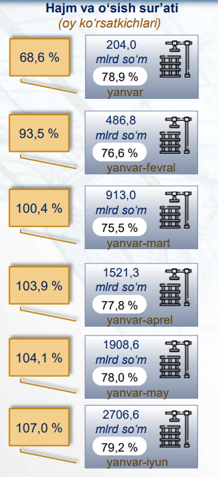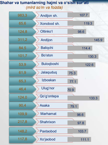 Bino va inshootlarni qurish faoliyat turi bo‘yicha bajarilgan qurilish ishlarining eng yuqori o‘sish sur’ati Andijon tumani (2022- yilga nisbatan 145,9 %), Qo‘rg‘ontepa tumani (2022- yilga nisbatan 133,3 %), Bo‘ston tumani (2022- yilga nisbatan 130,3 %)ga to‘g‘ri keldi.