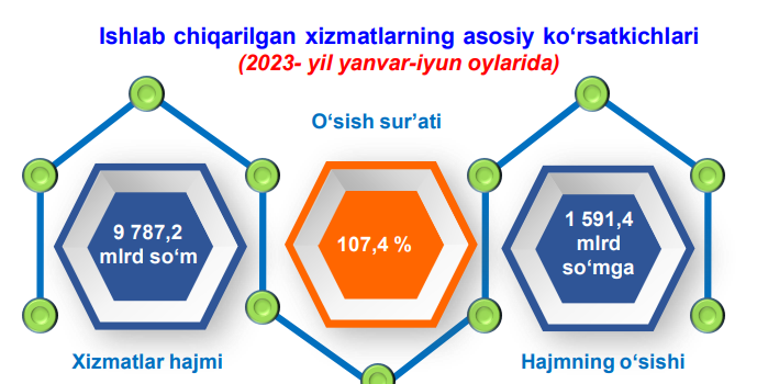 Dastlabki ma’lumotlarga ko‘ra, 2023- yil yanvar-iyun oylarida ko‘rsatilgan bozor xizmatlari hajmi 9 787,2 mlrd so‘mga yetdi. Taqqoslama ekvivalentda o‘tgan yilning shu davriga nisbatan o‘sish sur’ati 107,4 % ni tashkil etdi.