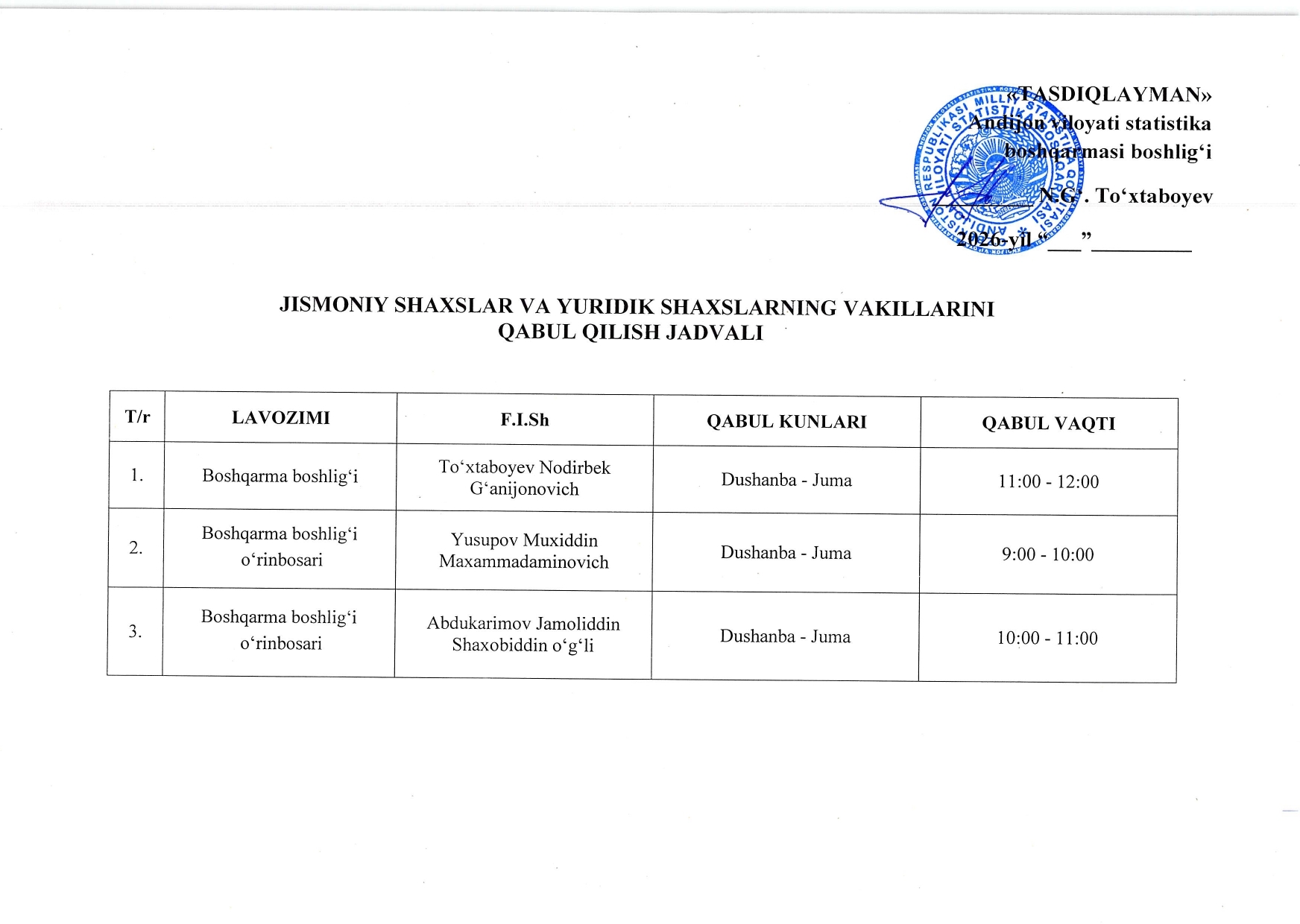 Andijon viloyati statistika boshqarmasi rahbariyatini jismoniy shaxslarni va yuridik shaxslarning vakillarini qabul qilish jadvali