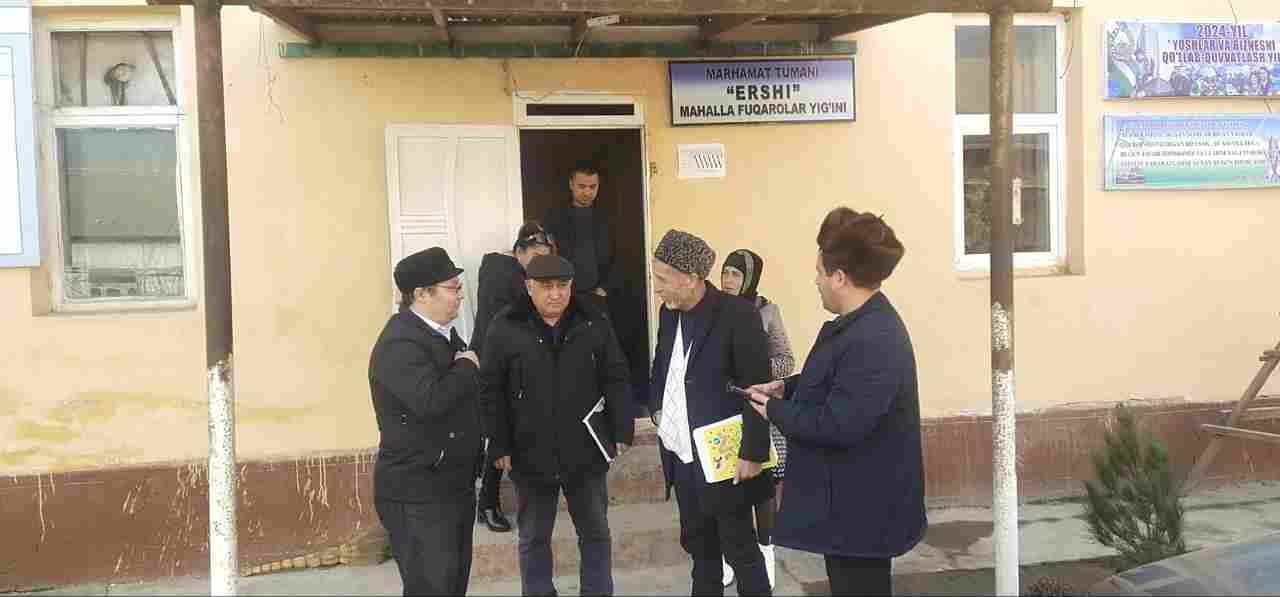 Joriy yilning 9-yanvar kuni Andijon viloyati statistika boshqarmasi boshlig‘ining o‘rinbosari D. Yangiyev hamda Turmush darajasi statistikasi va uy xo‘jaliklari kuzatuvlari bo‘limi boshlig‘i I. Xaydarov bilan birgalikda Marhamat tumani Ershi MFYda bo‘lib, mahalla faollari bilan 2024-yilda o‘tkaziladigan uy xo‘jaliklari kuzatuvlariga puxta tayyorgarlik ko‘rish bo‘yicha fikrlar almashdilar.