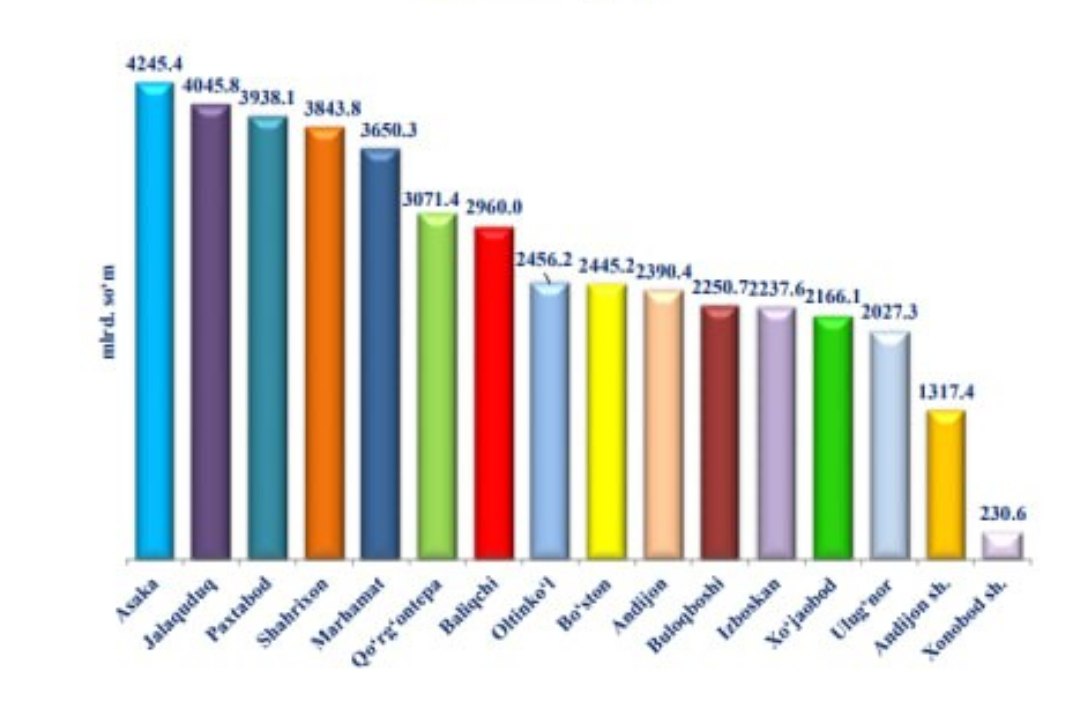 Aksincha kam hajmga ega hududlarga Xonobod (230,6 mlrd. so‘m) va Andijon shaharlari (1 317,4 mlrd. so‘m)ni keltirib o‘tish mumkin.