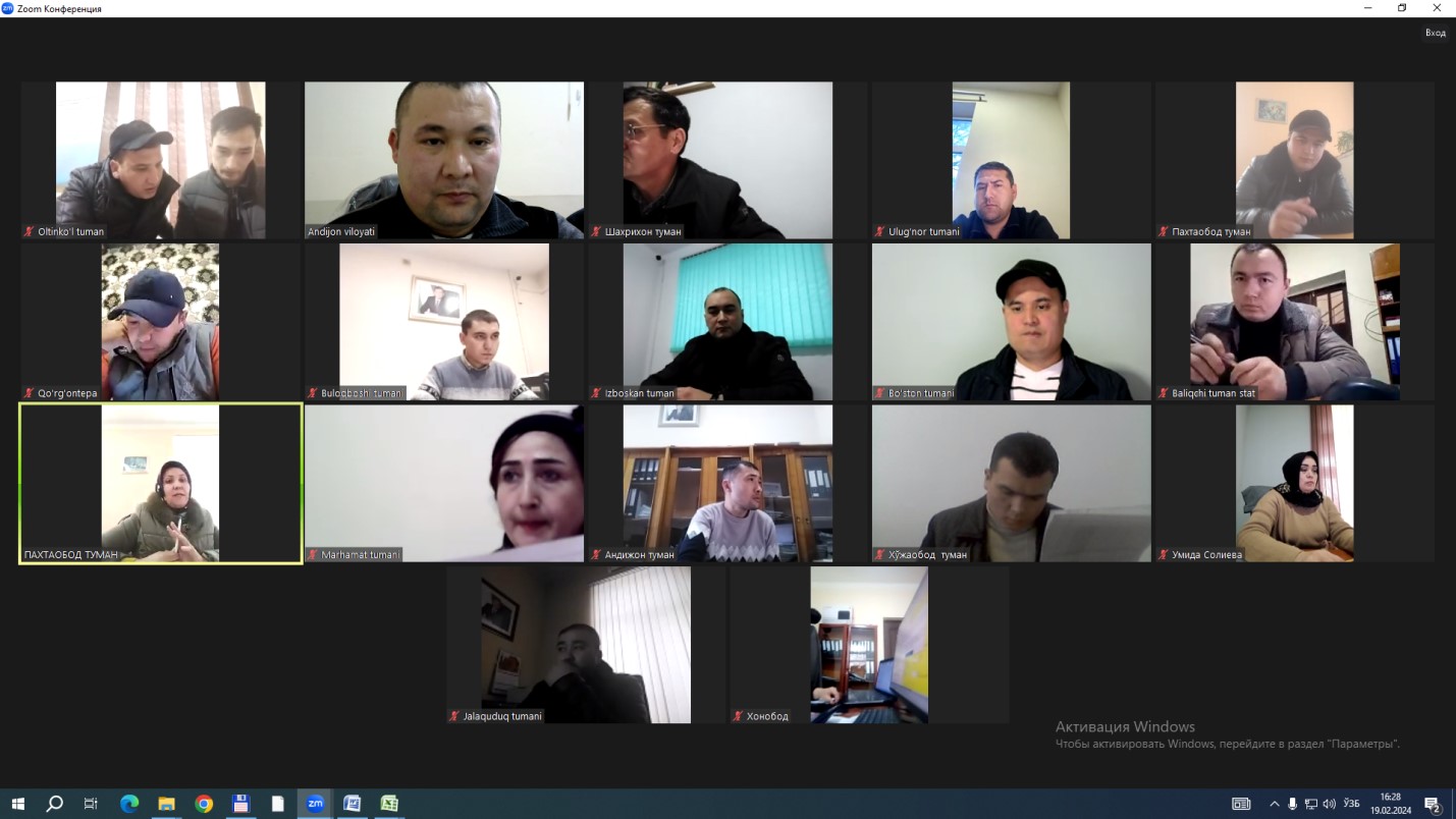 2024-yilning 19-fevral kuni “Xizmatlar sohasi kuzatuvlarini oʻtkazish” boʻyicha hududiy statistika bo‘limlari mas’ul xodimlarining bilim va ko‘nikmalarini oshirish maqsadida onlayn ravishda vebinar tashkil etildi. Vebinarda boshqarma boshlig‘ining o‘rinbosari D.Yangiyev va Xizmatlar sohasi statistikasi bo‘limi xodimlari hamda hududuy statistika bo‘lim xodimlari ishtirok etishdi.