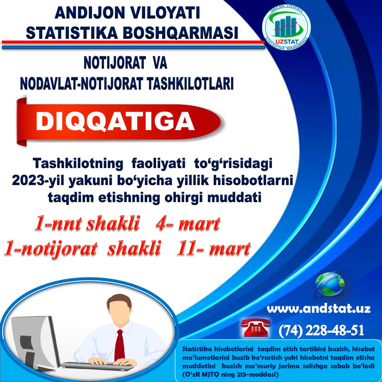 2026 yil 1 aprel holatiga ko'ra Andijon viloyatida 27 548 ta korxona va tashkilotlar mavjud