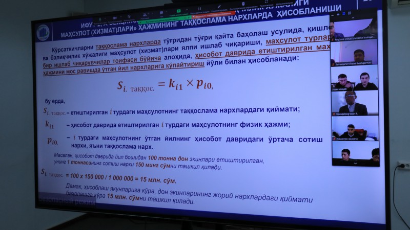 Shuningdek, vebinarda xodimlarga qishloq xo‘jaligi va ekologiya statistikasiga oid koʻrsatkichlarni shakllanishtirish tartibi va uslubiyoti batafsil tushuntirib berildi. Ushbu koʻrsatkichlarni hududlar kesimida hisoblash va e’lon qilish tartibi misollar bilan koʻrsatildi va ularni qiziqtirgan savollariga javob berildi.