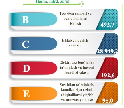 Sanoat ishlab chiqarishi tarkibida eng katta ulush ishlab chiqaradigan sanoat hissasiga to‘g‘ri kelib, 28 949,2 mlrd. so‘mni, jami sanoat ishlab chiqarishidagi ulushi 97,4 % ni tashkil etdi.