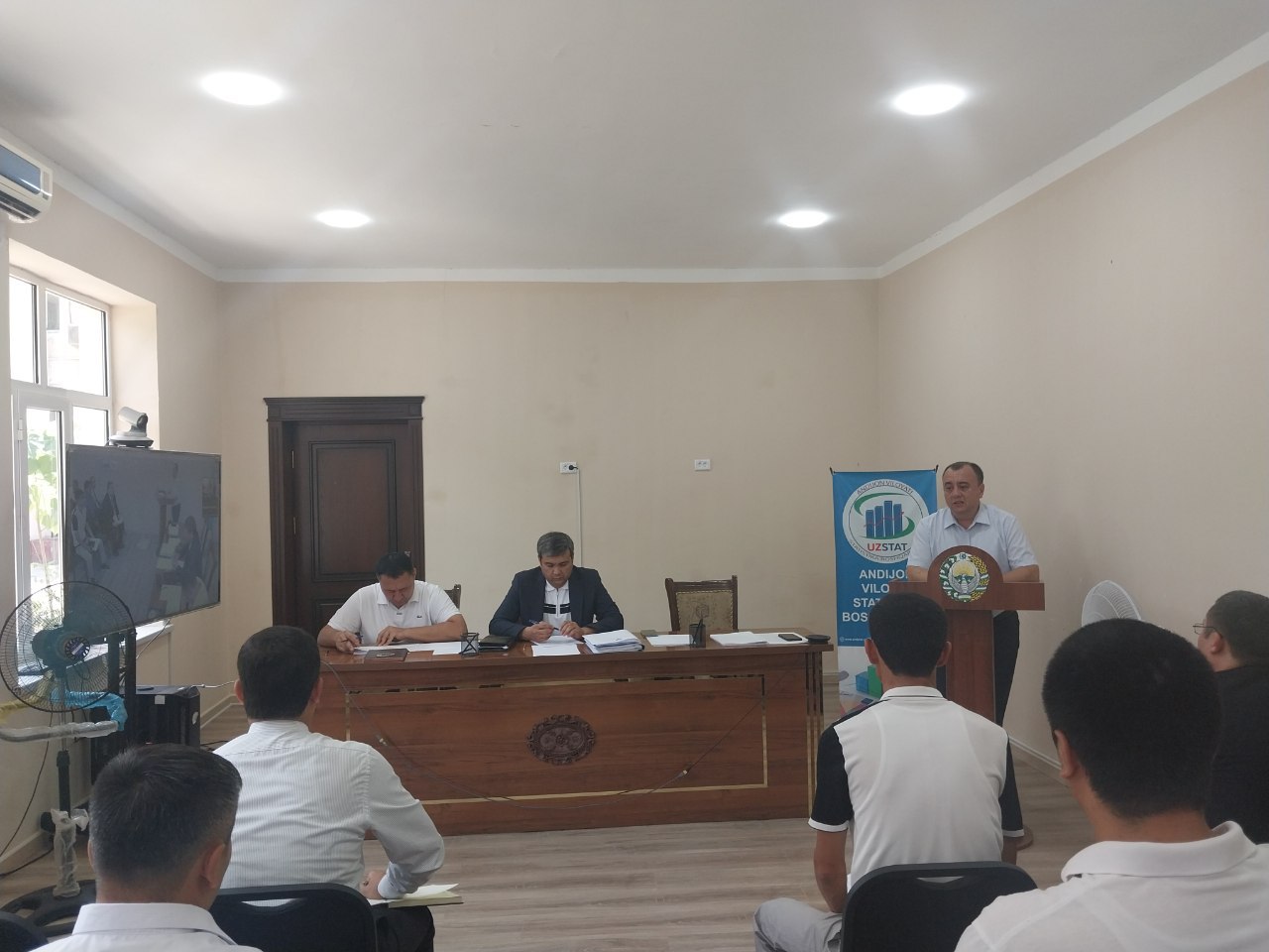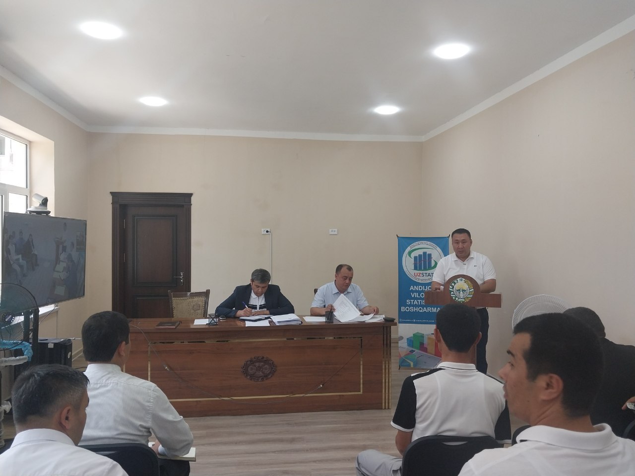 Joriy yilning 27-iyun kuni Andijon viloyati statistika boshqarmasida faoliyatni tashkil etish masalalarida o‘tkazilgan kompleks o‘rganish natijalarini muhokama qilish yuzasidan O'zbekiston Respublikasi Prezidenti huzuridagi Statistika agentligi raisi o‘rinbosari Z. Ziyayev raisligida masofaviy tarzda yig‘ilish bo‘lib o‘tdi.