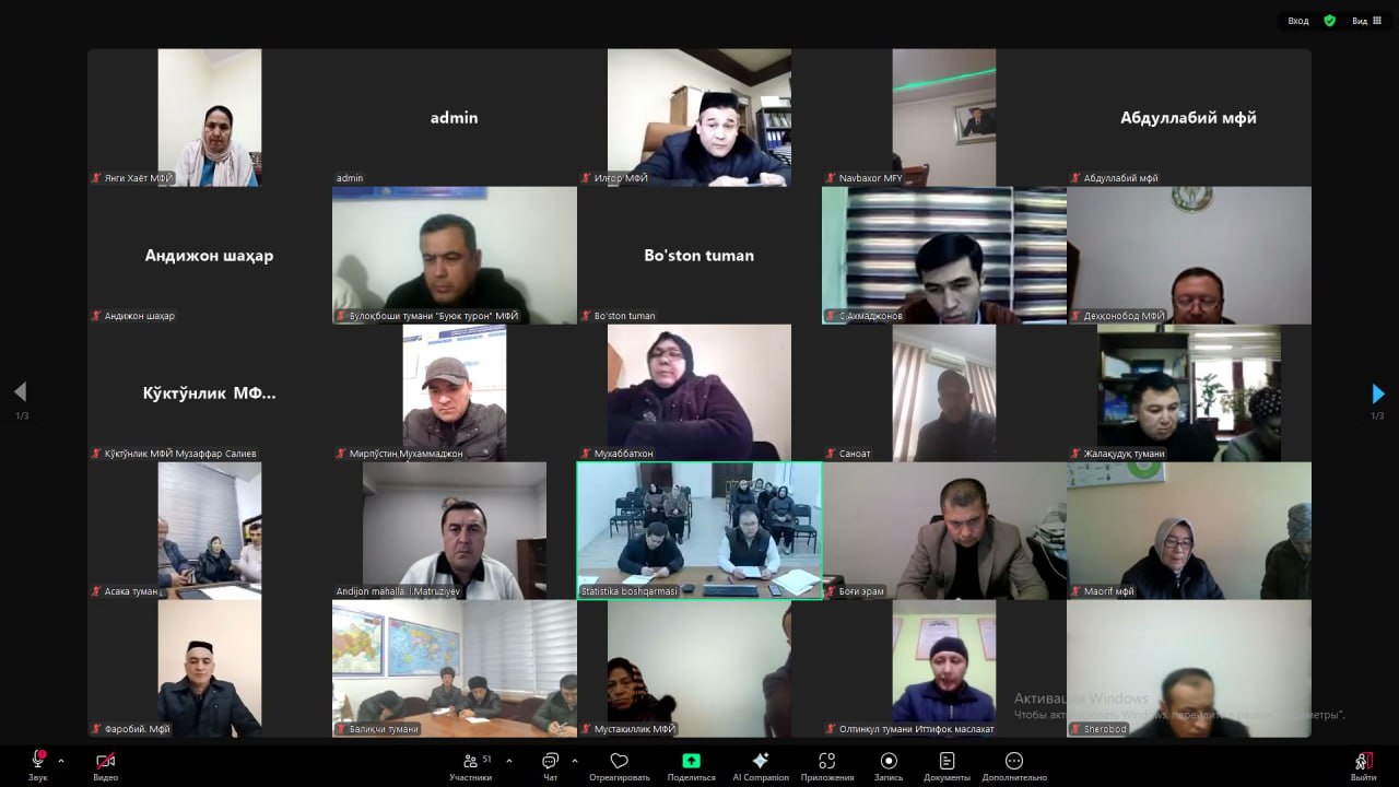 Seminarda Andijon viloyati statistika boshqarmasi boshlig‘ining o‘rinbisari D. Yangiyev, Turmush darajasi statistikasi va uy xo‘jaliklari kuzatuvlari bo‘limi xodimlari va 2025-yil uchun tanlovga tushgan Mahalla fuqarolar yig‘inlari xodimlari ishtirok etdilar.