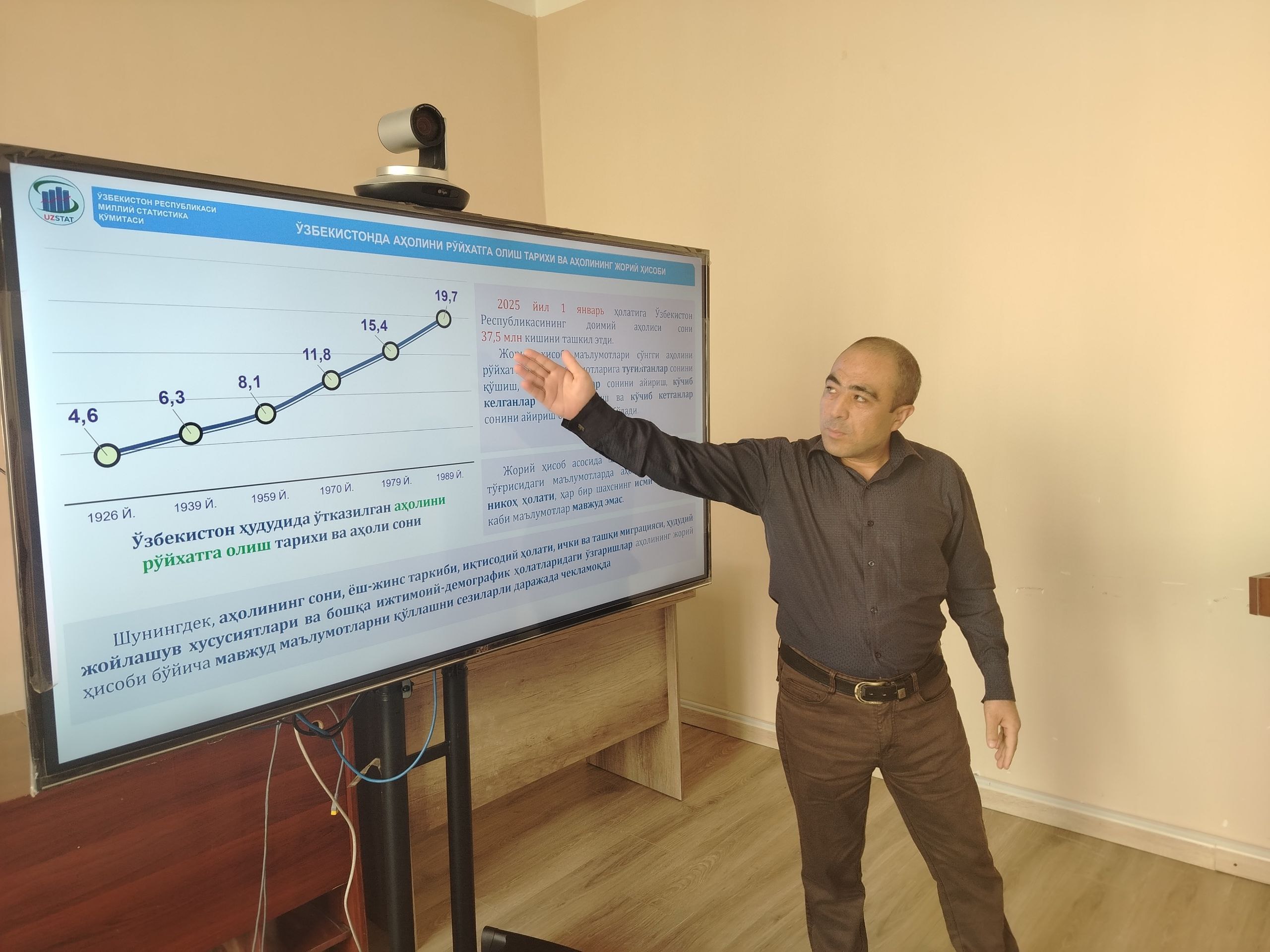Yig'ilish avvalida bo‘lim boshlig‘i B.G‘ulomjonov yig‘ilganlarga ushbu tadbirning asosiy maqsadi va dolzarbligi haqida talabalarga ma’lumot berdi. Mamlakatimizda 1989-yildan buyon ilk bor tashkil etilayotgan aholini ro‘yxatga olish jarayonlarining mazmun-mohiyatini talabalarga yetkazish maqsadida tashkil etildi.
