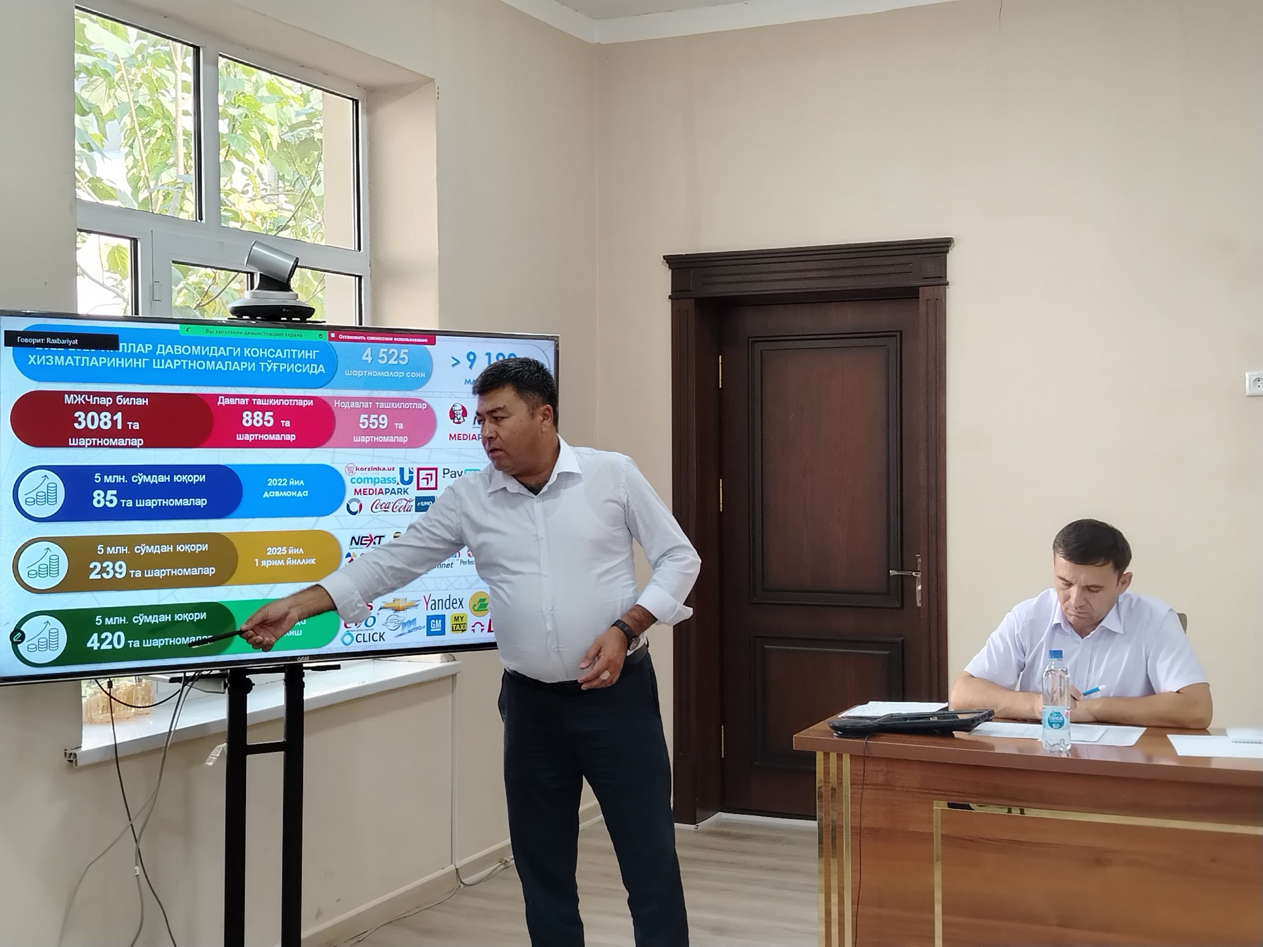 Shuningdek, 2025-yilning ikkinchi yarmida konsalting xizmatini amaliyotga to‘liq joriy etish bo‘yicha ustuvor vazifalar belgilab olindi. Tadbir yakunida ishtirokchilar o‘z fikr-mulohazalarini bildirib, xizmatning ahamiyatini yuqori baholadilar hamda uni tadbirkorlar bilan ishlashda samarali vosita sifatida qo‘llash bo‘yicha takliflarini bildirdilar.