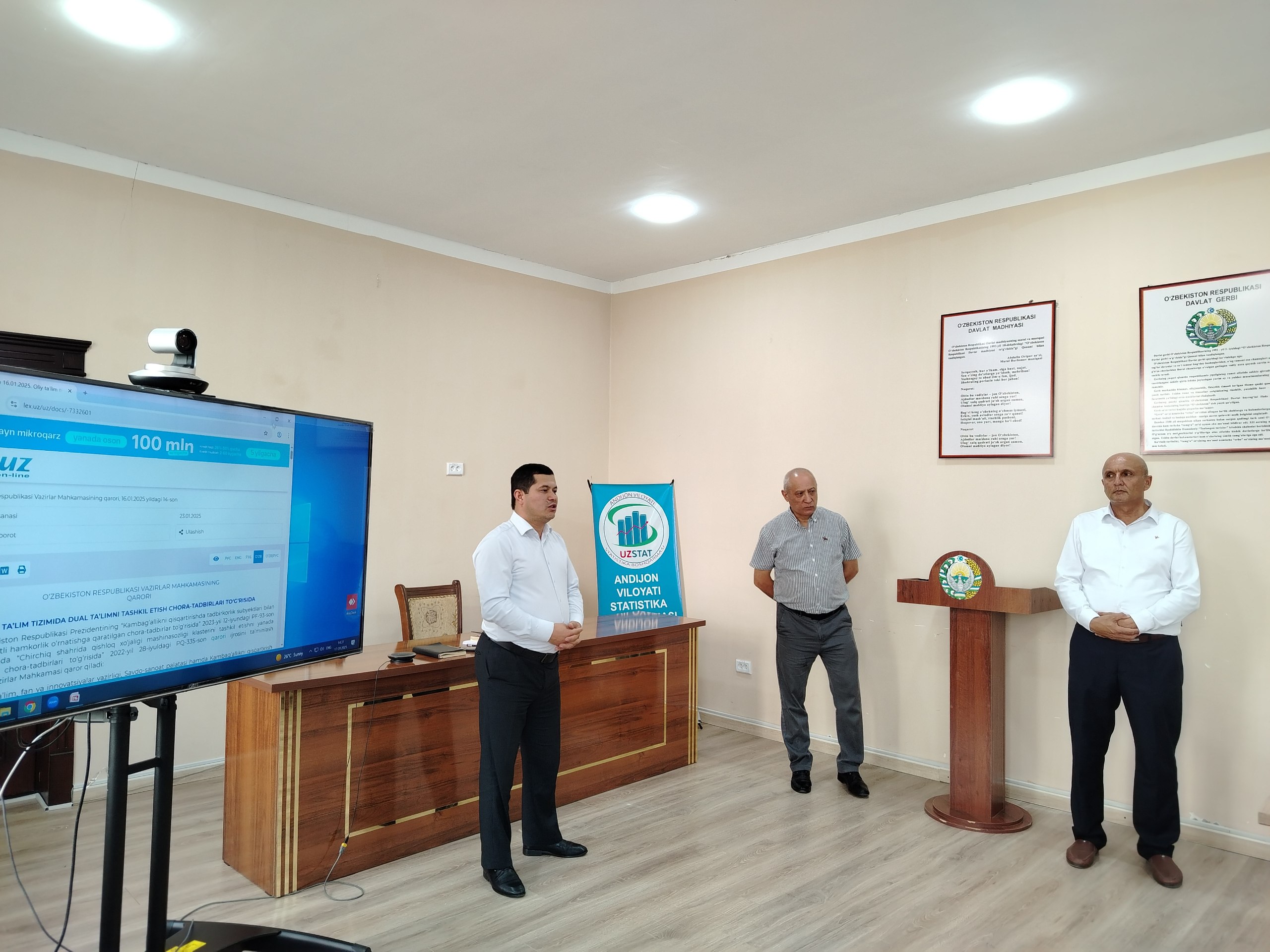 Joriy yilning 17-sentyabr kuni Andijon viloyati statistika boshqarmasida Andijon davlat texnika instituti talabalari ishtirokida “Ta’lim to‘g‘risida”gi O‘zbekiston Respublikasi Qonuniga muvofiq, yoshlarning kasblar va mutaxassisliklarni egallashga bo‘lgan qiziqishlarini qo‘llab-quvvatlash uchun keng imkoniyatlar yaratish hamda professional ta’lim tizimida dual ta’limni tashkil etish bo'yicha davra suhbati tashkil etildi.
