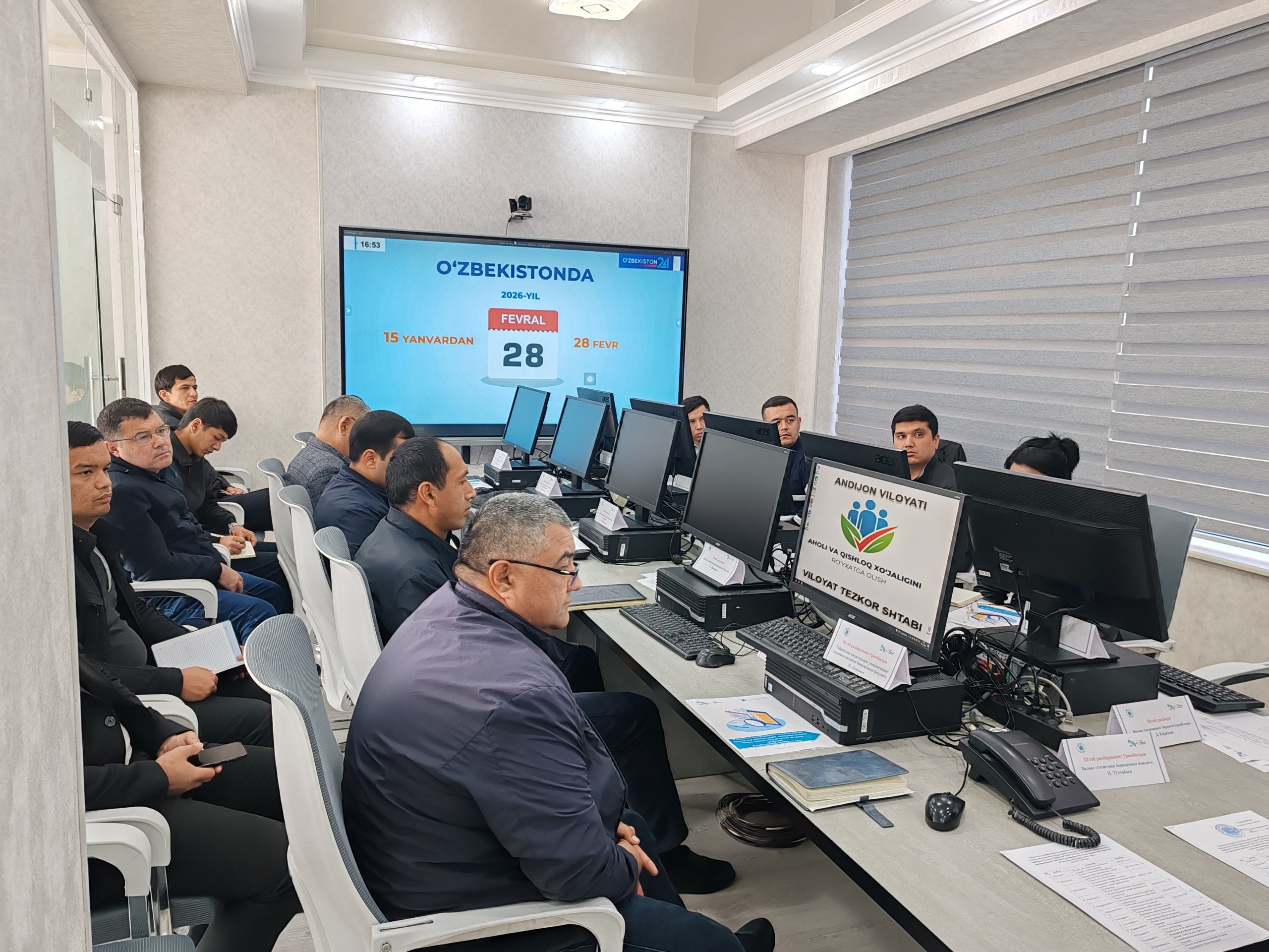 Joriy yilning 5-noyabr kuni Andijon viloyati shtabida o‘tkazilgan yig‘ilishda Kambag‘allaikni qisqartirish va bandlik vazirligidan vakil J.Rashidov, Milliy statistika qo‘mitasi bo‘lim boshlig‘i M.Toshpulatovlar Andijon viloyatida bo‘lib, aholi va qishloq xo‘jaligini ro‘yxatga olish tadbiriga tayyorgarlik ishlari bilan tanishdi.