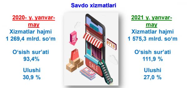 2021- yil yanvar-may oyida, ko‘rsatilgan bozor xizmatlari umumiy hajmida savdo xizmatlarining ulushi 27,0 % ni tashkil etdi, bu esa 1 575,3 mlrd. so‘mga to‘g‘ri keldi.
