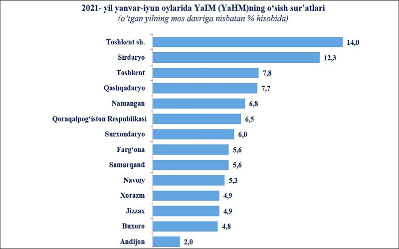 Hududlar kesimida yuqori o‘sish sur’atlari Toshkent sh. (14,0 %), Sirdaryo (12,3 %), Toshkent (7,8 %) va Qashqadaryo (7,7 %) viloyatlarida qayd etildi.