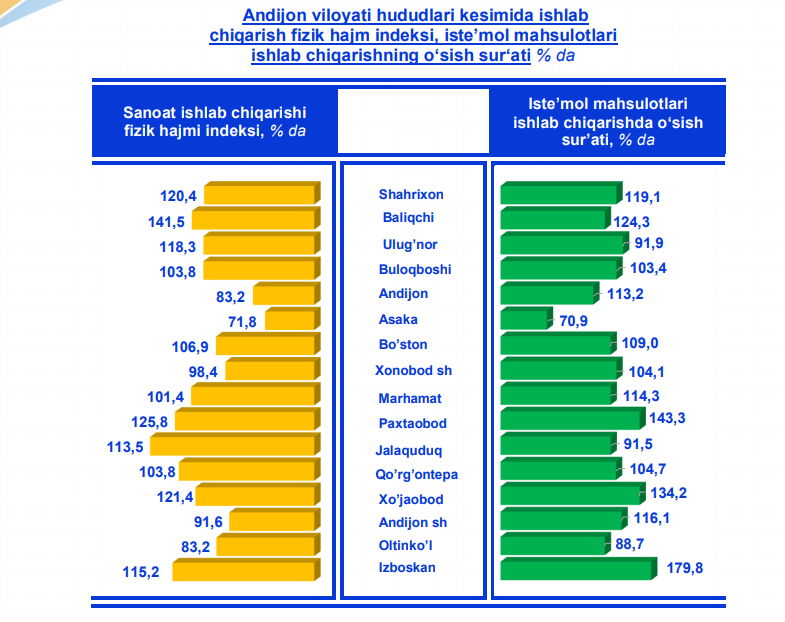 Andijon viloyatida sanoat mahsulotlari ishlab chiqarishda Qo’rg’ontepa (2020- yilning yanvar-iyun oyiga nisbatan 103,8 %), Jalaquduq (113,5 %), Izboskan (115,2 %), Paxtaobod (125,8 %) va Baliqchi (141,5 %) , Buloqboshi (103,8 %) ,Ulug’nor (118,3 %), tumanlarida sezilarli darajada oshdi.