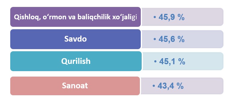 2022- yilning I choragida tanlanma kuzatuvda ishtirok etgan kichik korxona va mikrofirmalarninig yaqin 3 oydagi o‘zgarishlar istiqboli bo‘yicha iqtisodiy vaziyatni qulay deb baholagan korxonalarning iqtisodiy faoliyat turlari bo‘yicha eng ko‘p ulushi qishloq, o‘rmon va baliqchilik xo‘jaligida – 45,9 % ni, savdoda 45,6 % ni, qurilishda 45,1 % ni, sanoatda 43,4 % ni tashkil etdi.