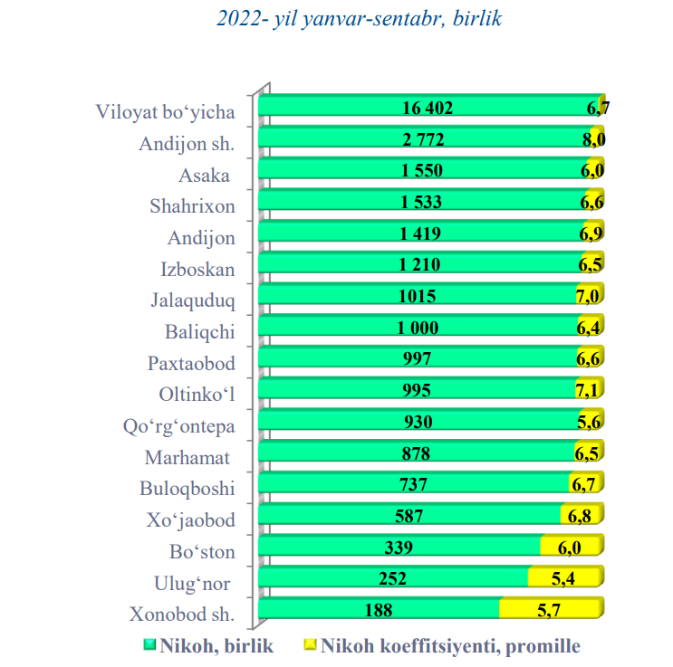 Nikoh koeffitsiyentining eng ko‘p pasayishi Asaka va Ulug‘nor tumanlari 0,5 prоmillega) va Marhamat tumani (0,8 prоmillega) kuzatildi.