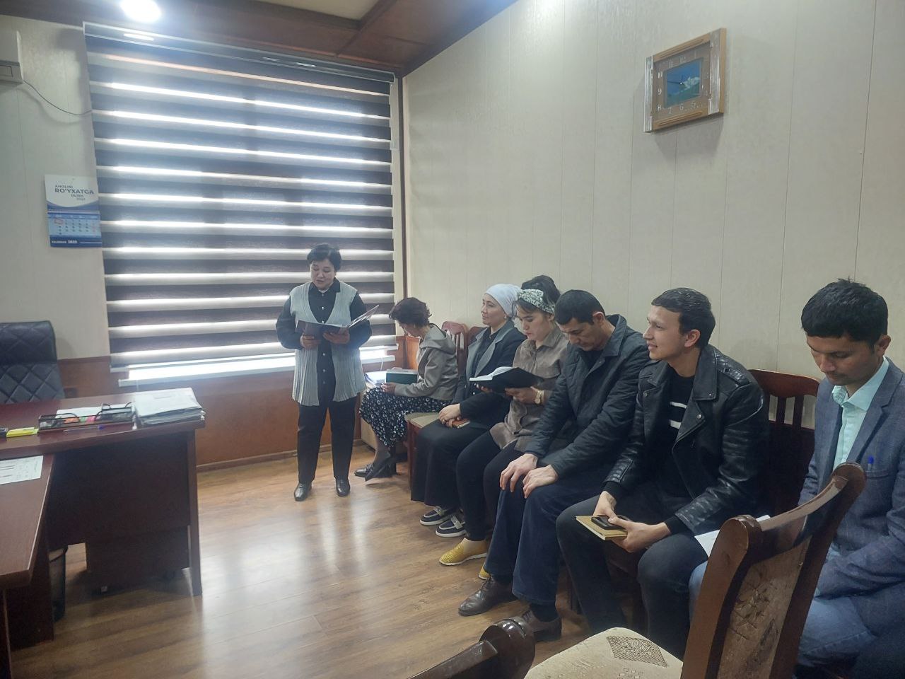 2023- yil 9- aprel kuni boshqarmada navbatdagi “Tеmur tuzuklari”: Odillik va adolat, huquq va maʼnaviyat mavzusida ma’naviyat soati bo‘lib o‘tdi. Tadbirda boshqarma bolig‘ining o‘rinbosari M.Yusupov, ma’naviy va ma’rifiy ishlar mas’ul xodimi J.Tuxtabayeva hamda boshqarma xodimlari ishtirok etdilar.