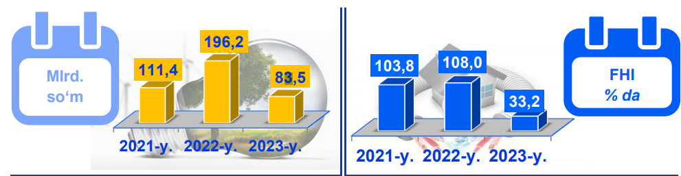 Elektr, gaz, bug‘ bilan ta’minlash va havoni konditsiyalash korxonalari tomonidan ishlab chiqarilgan mahsulotlar hajmi 83,5 mlrd.so‘mni (jami ishlab chiqarilgan sanoat mahsulotlari hajmining (0,5 % ini) tashkil etdi. 2023- yilning yanvar-aprel oylarida, sanoatning mazkur tarmog‘ida elektr energiyani ishlab chiqarish, uzatish va taqsimlash, bug‘ bilan ta’minlash tizimlari va havoni konditsiyalashning o‘tgan yilning mos davriga nisbatan fizik hajm indeksi 66,8 % ga kamayishi kuzatildi.