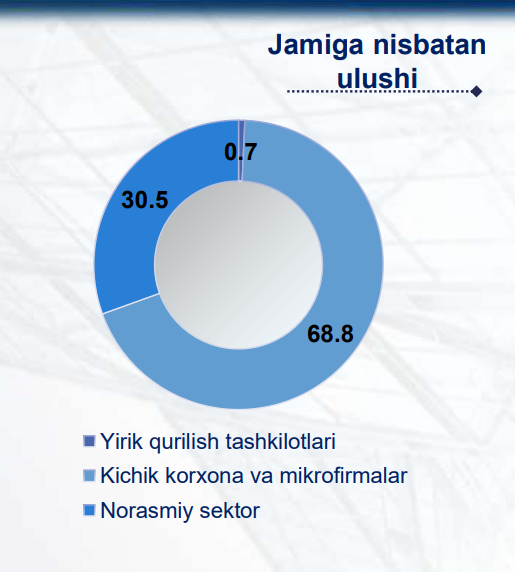 Bino va inshootlarni qurish bo‘yicha qurilish ishlari tarkibida yirik qurilish tashkilotlari tomonidan bajarilgan qurilish ishlari ulushi 0,7 % ni tashkil etib, 2022- yilning mos davridagi ko‘rsatkichga nisbatan 0,5 % punktga kamaydi.Ushbu faoliyat turida kichik korxona va mikrofirmalar hissasiga to‘g‘ri kelgan ulush 2022- yilning yanvaraprel oylariga nisbatan 0,5 % punktga ko‘payib, 68,8 % ni tashkil etdi. Norasmiy sektorning 30,5 % ni tashkil etdi.