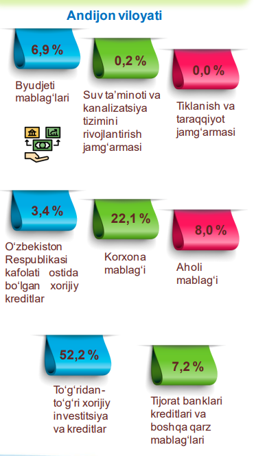 2022- yilning yanvar-mart oylarida korxona va tashkilotlarning o‘z mablag‘lari hisobidan moliyalashtirilgan asosiy kapitalga investitsiyalar – 618,3 mlrd so‘m yoki jami asosiy kapitalga investitsiyalarning 22,1% ini tashkil etdi.Aholi mablag‘lari hisobidan jami asosiy kapitalga investitsiyalarning 8,0 % yoki 223,2 mlrd so‘mi o‘zlashtirildi. To‘g‘ridan-to‘g‘ri xorijiy investitsiyalar hisobidan o‘zlashtirilgan investitsiyalar hajmi 1 461,5 mlrd so‘mni yoki 52,2 % ni tashkil etdi. Shuningdek, tijorat banklari kreditlari va boshqa qarz mablag‘lari hisobidan 202,3 mlrd so‘m, Davlat kafolati ostidagi xorijiy kreditlar 94,0 mlrd so‘m, Davlat byudjeti 192,7 mlrd so‘m, Suv ta’minoti va kanalizatsiya tizimlarini rivojlantirish jamg‘armasi tomonidan 6,7 mlrd so‘m miqdorida asosiy kapitalga inestitsiyalar o‘zlashtirildi.