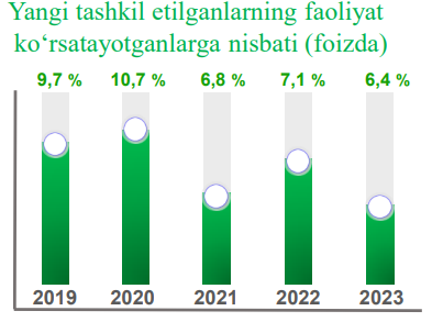 2023- yil yanvar-may oylarida yangi tashkil etilgan korxona va tashkilotlar soni 1 994 tani tashkil etdi. Yangi tashkil etilgan korxona va tashkilotlar sonining tashkiliy-huquqiy shakli bo‘yicha, mas’uliyati cheklangan jamiyatlar 1 726 ta, oilaviy korxonalar 131 ta, xususiy korxonalar 39 tani tashkil etgan.