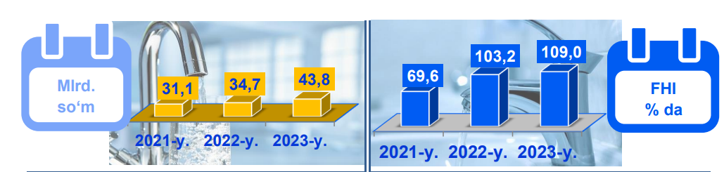 Suv bilan ta’minlash, kanalizatsiya tizimi, chiqindilarni yig‘ish va utilizatsiya qilish korxonalari tomonidan ishlab chiqarilgan mahsulotlar hajmi 43,8 mlrd.so‘mni (jami ishlab chiqarilgan sanoat mahsulotlari hajmining 0,3 % ini) tashkil etdi.