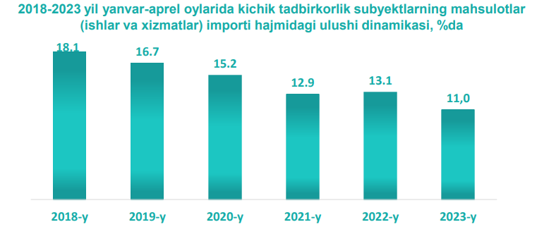 2023- yil yanvar-aprel oylarida kichik biznes subyektlari mahsulot (ishlar va xizmatlar) importining hajmi 335,2 million AQSH dollarini yoki umumiy importning 11,0 % ini tashkil etdi.2023- yil yanvar-aprel oylarida hududlar bo‘yicha kichik tadbirkorlik subyektlari tomonidan amalga oshirilgan mahsulotlar (ishlar va xizmatlar) importining jamiga nisbatan eng yuqori ulushi Buloqboshi tumanida – 100,4 %, Jalaquduq tumanida – 97,6 %, Qo’rg’ontepa tumanida – 94,6 %, Ulug’nor tumanida – 93,1 %, Oltinko’l tumanida – 90,1 %, Izboskan tumanida – 72,1 % ni tashkil etdi. Eng past ko‘rsatkich Asaka tumanida – 1,0 % ni tashkil etdi.