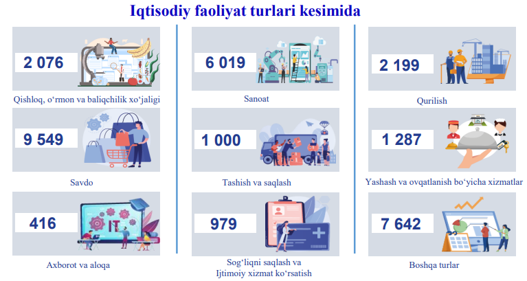 2023- yil 1- iyun holatiga koʻra faoliyat ko‘rsatayotgan korxona va tashkilotlar soni 2019- yilning mos davriga nisbatan o‘sish sur’ati 102,8 foizni tashkil etdi.Ularning iqtisodiy faoliyat turlari bo‘yicha taqsimlanishi (umumiy sonidagi ulushi) quyidagicha bo‘ldi: savdo – 30,6 foiz, sanoat – 19,3 foiz, qurilish – 7,1 foiz, qishloq, o‘rmon va baliqchilik xo‘jaligi – 6,7 foiz, hududiy kesimda eng ko‘p Andijon shahrida – 25,1 foiz, Asaka – 9,0 foiz, Andijon – 7,6 foiz, Shahrixon – 7,1 foiz va Baliqchi – 6,1 foiz tumanlarida faoliyat ko‘rsatmoqda.