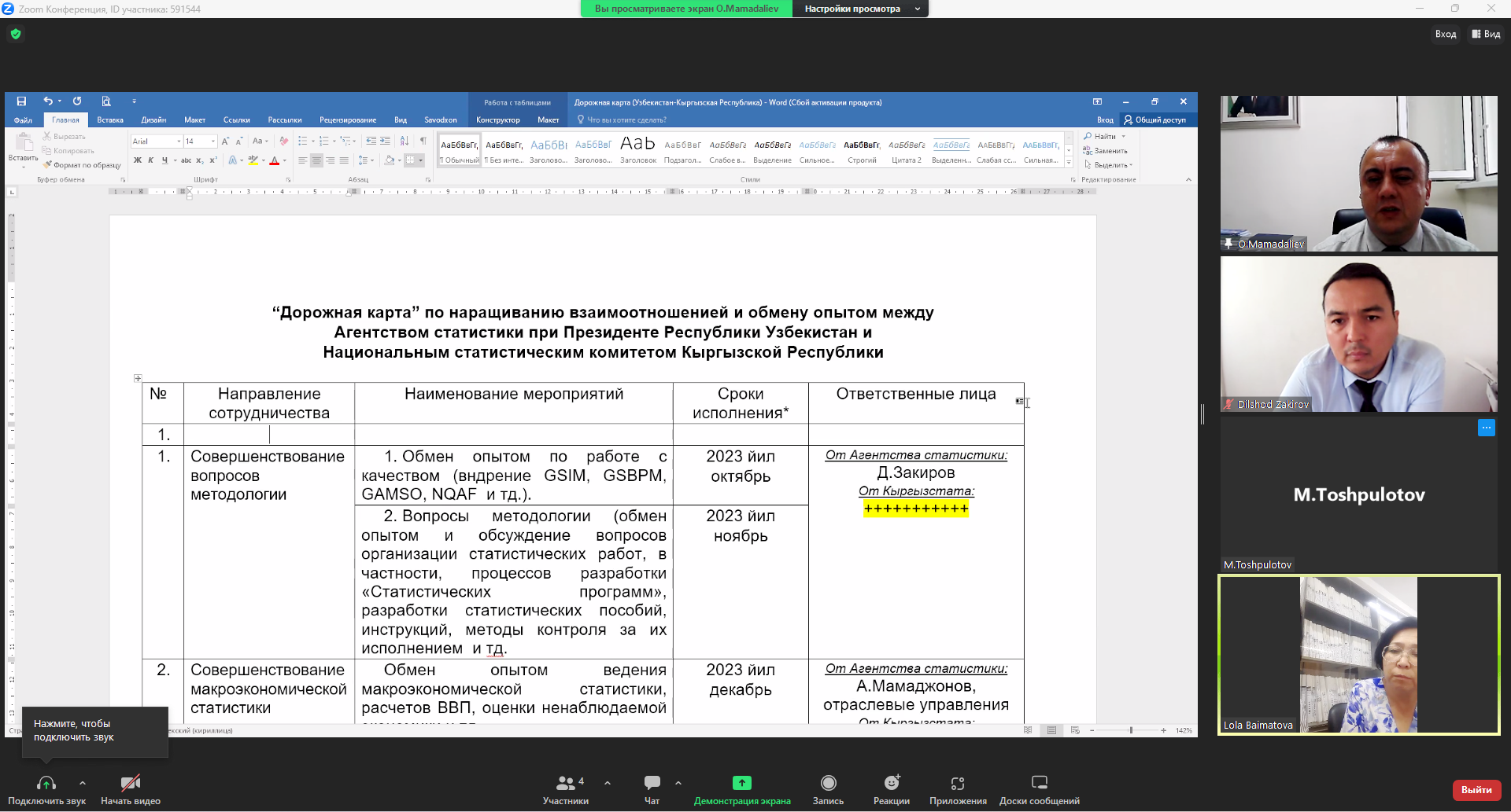 Videokonfrensaloqada ham ishtirokchilar o‘zaro hamkorlik doirasida Statistika agentligi va Qirg‘iz Respublikasi Milliy statistika qo‘mitasi o‘rtasida o‘zaro manfaatli yo‘nalishlarda tajriba almashishni yo‘lga qo‘yish masalalarida fikr almashishdi.