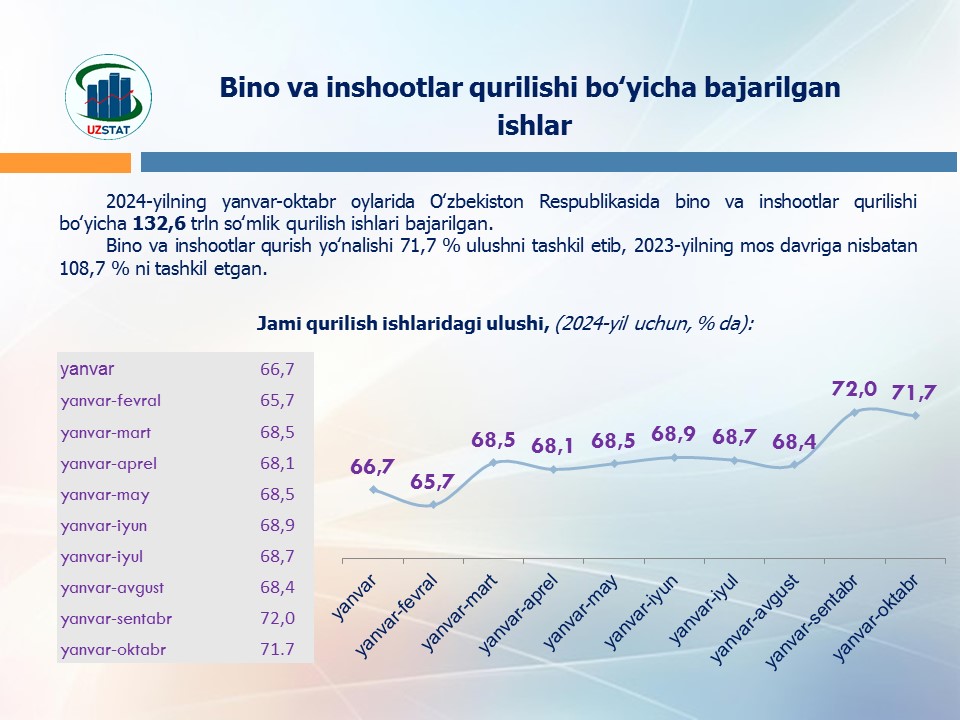2024-yilning 1-oktabr holatiga ulgurji savdo sohasida faoliyat ko‘rsatayotgan tijorat korxonalari soni 2 730 tani tashkil etdi.