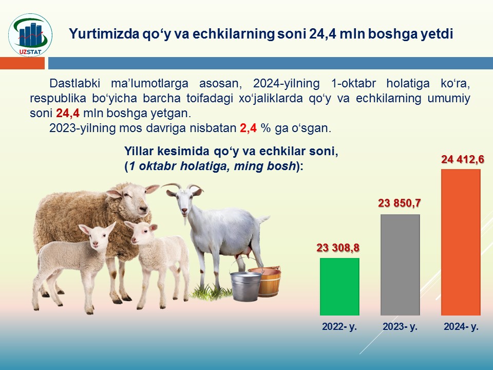 Viloyatda 2024-yilning yanvar-sentabr oylarida barcha toifadagi xo‘jaliklar tomonidan tirik vaznda 140,7 ming tonna go‘sht yetishtirildi.