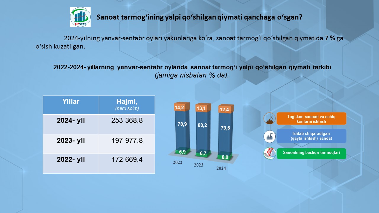 Tog‘-kon sanoati va ochiq konlarni ishlash korxonalari tomonidan 2024-yilning yanvar-sentabr oylarida ishlab chiqarilgan mahsulotlar hajmi 1 188,9 mlrd. so‘mni tashkil etdi.