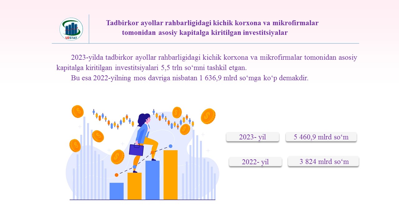 2024-yilning 1-yanvar holatiga ko'ra, Andijon viloyatida tadbirkor ayollar rahbarligidagi kichik korxona va mikrofirmalar soni 1 158 tani tashkil etgan.