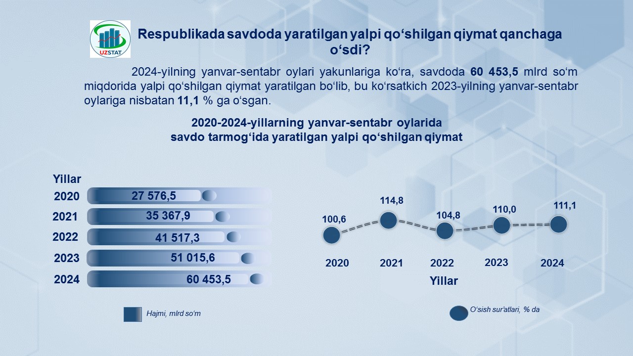 2024-yilning 1-noyabr holatiga Andijon viloyatida chakana savdo sohasida faoliyat ko‘rsatayotgan tijorat korxonalari soni 5 605 tani tashkil etdi.