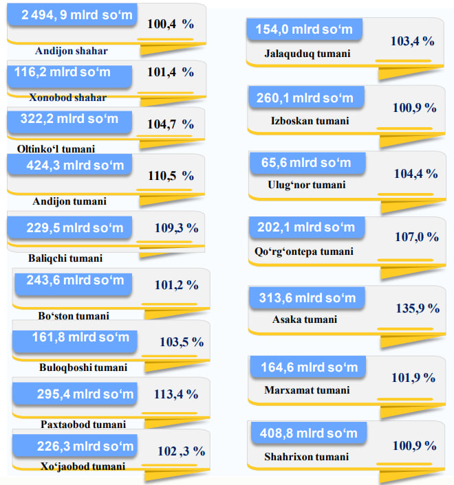 2024-yilning yanvar-sentabr oylari yakunlariga ko‘ra, Andijon viloyati bo‘yicha sanoatda yaratilgan yalpi qo‘shilgan qiymat hajmi 16 042,8 mlrd so‘mni tashkil etdi va o‘tgan yilning mos davri bilan taqqoslaganda 8,2 % ga o‘sdi.