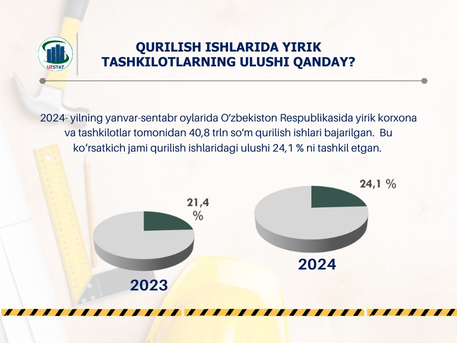 2024-yilning yanvar-sentabr oylarida Oʻzbekiston Respublikasida yirik korxona va tashkilotlar tomonidan 40,8 trln soʻm qurilish ishlari bajarilgan.