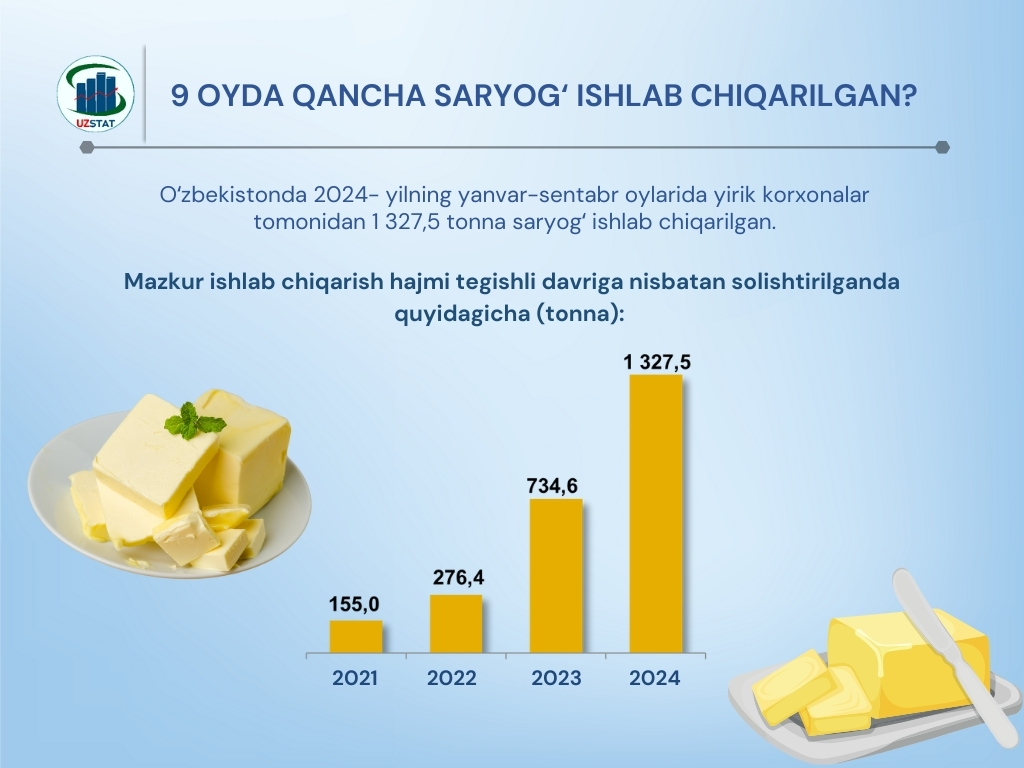 Oʻzbekistonda 2024-yilning yanvar-sentabr oylarida yirik korxonalar tomonidan 1 327,5 tonna saryogʻ ishlab chiqarilgan.