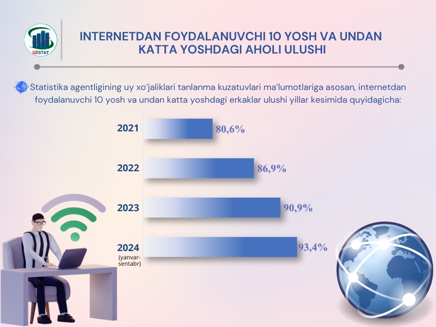 Statistika agentligining uy xo‘jaliklari tanlanma kuzatuvlari ma’lumotlariga asosan, 2024-yil yanvar–sentabr oylarida internetdan foydalanuvchi 10 yosh va undan katta yoshdagi aholi ulushi 92,7 % ni tashkil etdi.