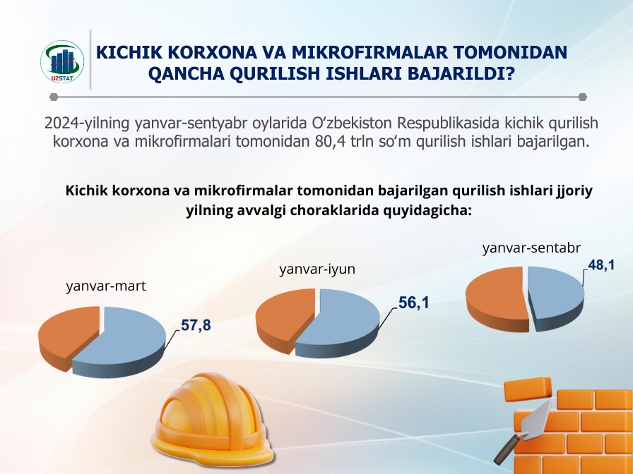 2024-yilning yanvar-sentabr oylarida Oʻzbekistonda kichik qurilish korxona va mikrofirmalari tomonidan 80,4 trln soʻm qurilish ishlari bajargan.