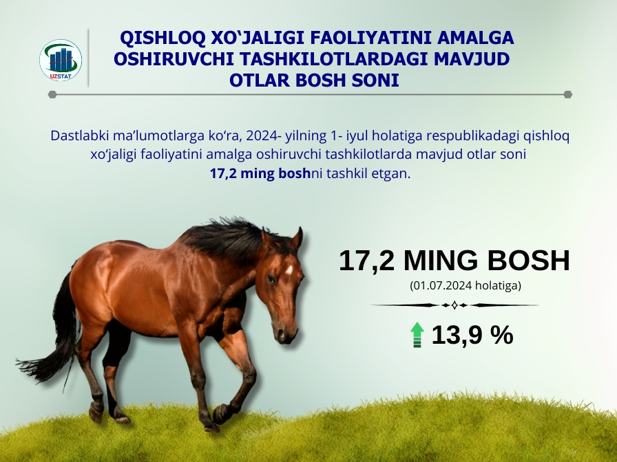 Dastlabki maʼlumotlarga koʻra, 2024-yilning 1-iyul holatiga respublikadagi qishloq xo‘jaligi faoliyatini amalga oshiruvchi tashkilotlarda mavjud otlar soni 17,2 ming boshni tashkil etgan.