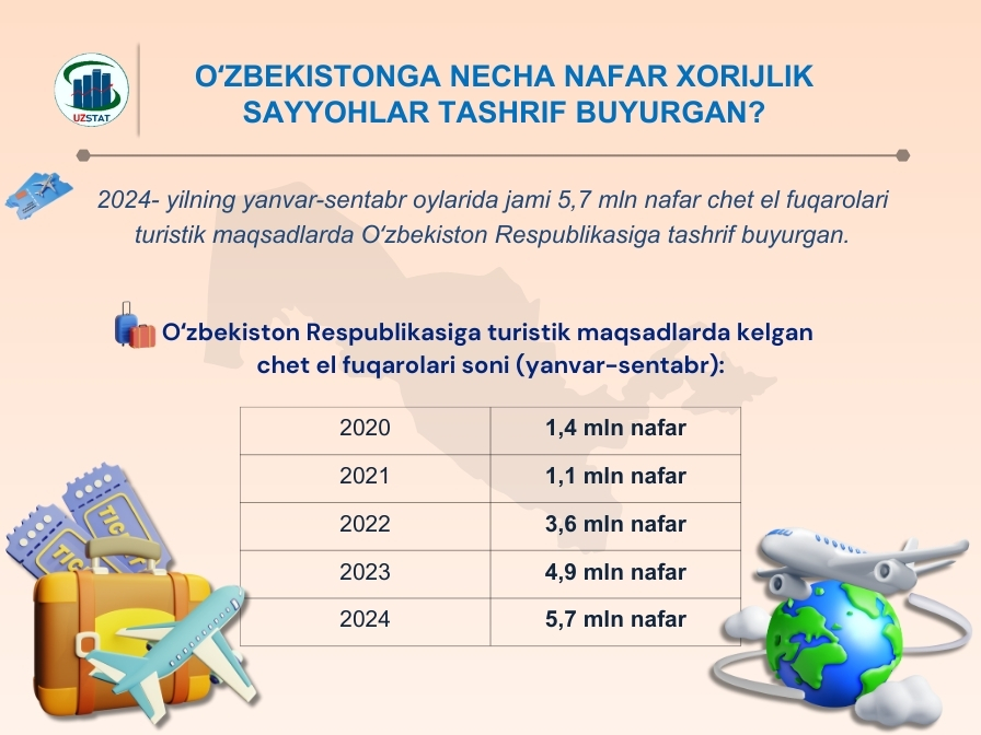 2024-yilning yanvar-sentabr oylarida jami 5,7 mln nafar chet el fuqarolari turistik maqsadlarda Oʻzbekiston Respublikasiga tashrif buyurgan.