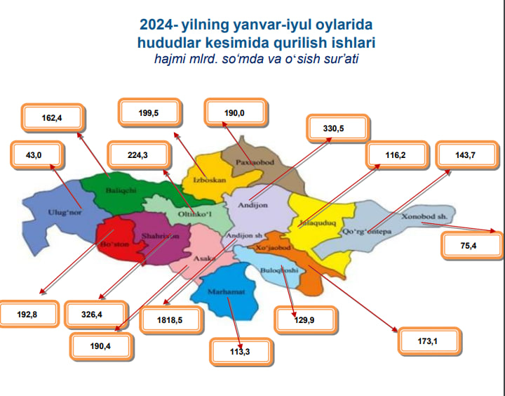 2024-yilning yanvar-iyul oyilarida, Andijon viloyatida jami 4 429,4 mlrd. so‘mlik qurilish ishlari bajarilib, 2023-yilning mos davriga nisbatan 102,3 % ni tashkil etdi.