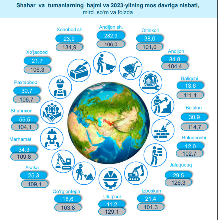 2024-yilning yanvar-fevral oylarida, Andijon viloyatida jami 734,2 mlrd. so‘mlik qurilish ishlari bajarilib, 2023-yilning mos davriga nisbatan 108,1 % ni tashkil etdi