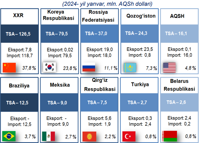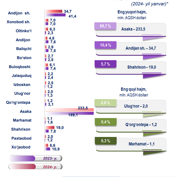 2024- yil yanvar oyida viloyatning tashqi savdo aylanmasi 334,8 mln.AQSh dollariga yetdi va 2023- yilning yanvar oyiga nisbatan 39,1 mln. AQSh dollariga yoki 13,2 % ga ko‘paydi.