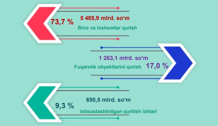 2023-yilning yanvar-dekabr oylarida Oʻzbekiston Respublikasida bino va inshootlar qurilishi boʻyicha 105 trln. soʻmlik qurilish ishlari bajarilib, umumiy hajmga nisbatan ulushi 70,1 % ni tashkil etgan.