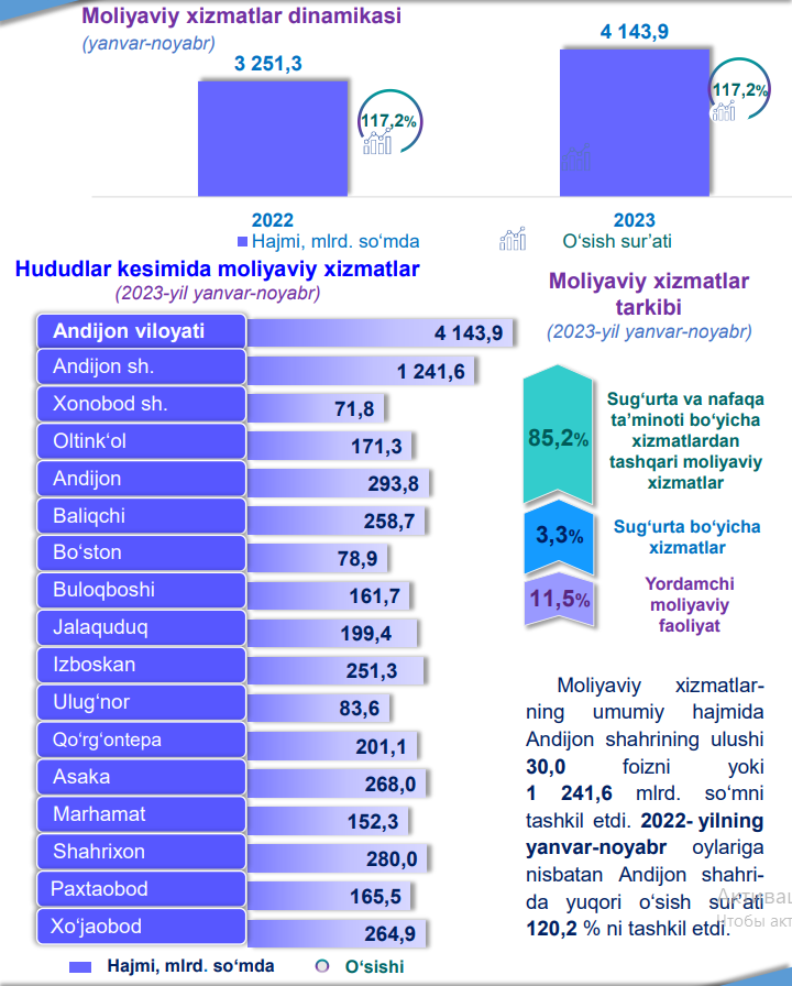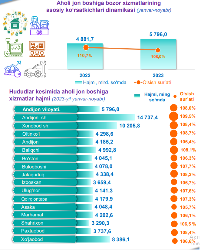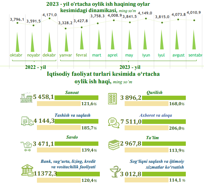 Andijon viloyatida 2023-yil yanvar-sentabr oylarida iqtisodiy faoliyat turlari bo‘yicha o‘rtacha oylik ish haqining eng yuqori ko‘rsatkichi – axborot va aloqa sohasiga to‘g‘ri kelib, o‘tgan yilning mos davriga nisbatan o‘sish darajasi 206,0 % ni tashkil etdi.