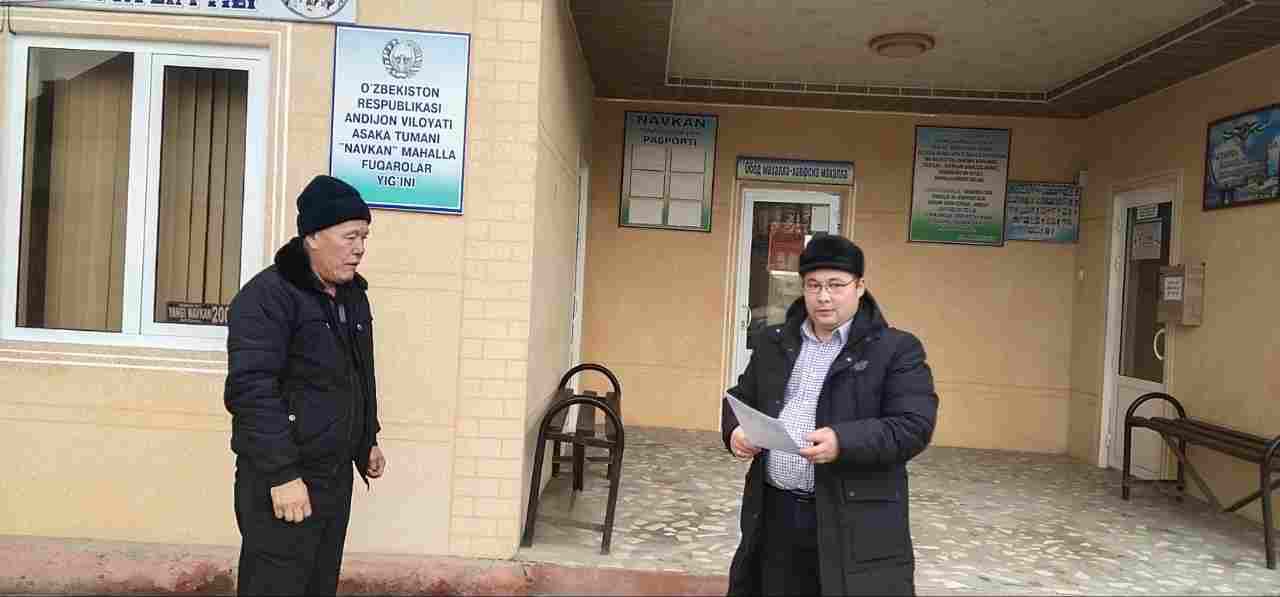 Joriy yilning 27-dekabr kuni Andijon viloyati statistika boshqarmasi boshlig‘ining o‘rinbosari D. Yangiyev Asaka tumani O‘zbekiston MFYda bo‘lib, mahalla faollari bilan 2024-yilda o‘tkaziladigan uy xo‘jaliklari kuzatuvlariga puxta tayyorgarlik ko‘rish bo‘yicha fikrlar almashdilar.