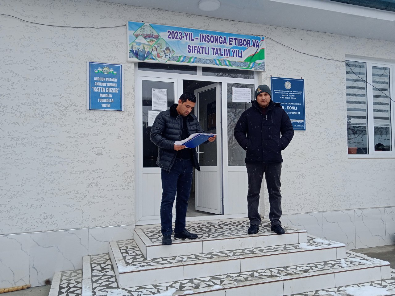 Joriy yilning 12-dekabr kuni Аndijon viloyati statistika boshqarmasi Ro‘yxatga olish jarayonlarini tashkil etish va o‘tkazish bo‘limi boshlig‘i B.G‘ulomjonov tomonidan Andijon tumani Katta guzar MFYda xonadonlar raqamlanish holati hamda nomi o‘zgargan ko‘chalarga yangi nom belgilarini o‘rnatish jarayoni o‘rganildi.