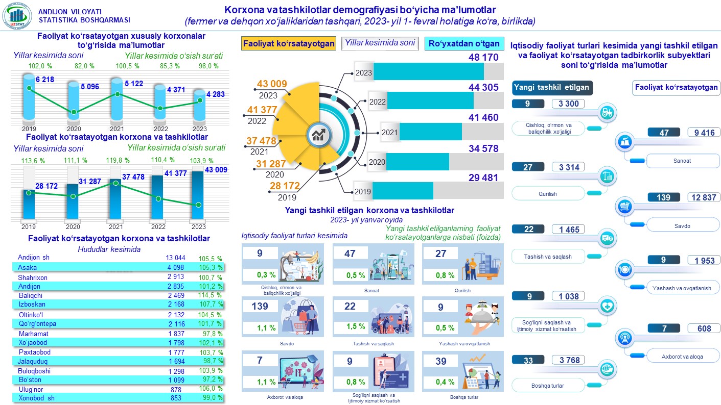 Respublikamizda 2023- yilning 1-fevral holatiga jami 55 966 ta oilaviy korxonalar faoliyat yuritmoqda. Ularning hududlar kesimidagi soni quyidagicha shakllandi: