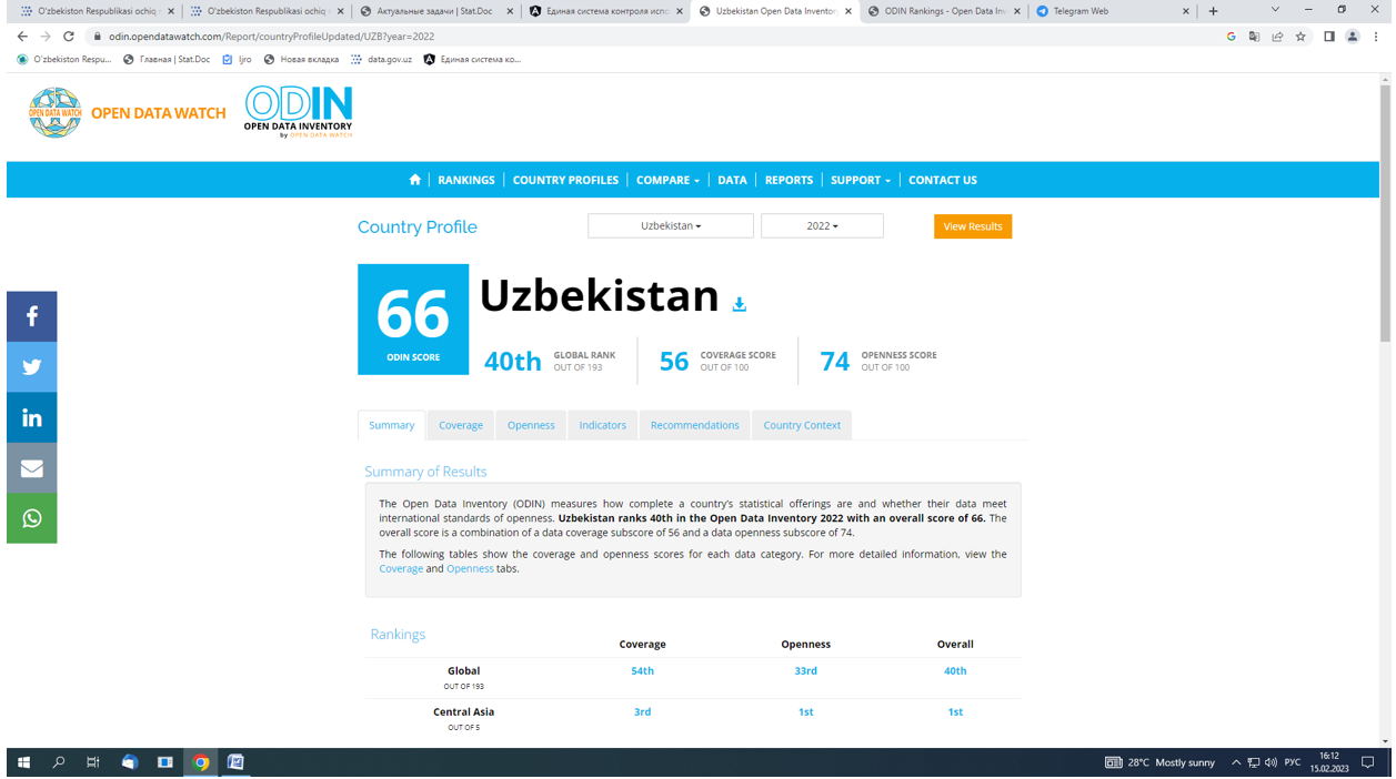 Oʻzbekiston Respublikasi Open Data Inventory (ODIN) ochiq ma’lumotlar reytingida 66 ballni toʻplagan holda mazkur reytingda dunyoda 40-oʻringa ko‘tarildi hamda Markaziy Osiyoda 1-oʻrinni saqlab qoldi. https://odin.opendatawatch.com/Report/countryProfileUpdated/UZB?year=2022